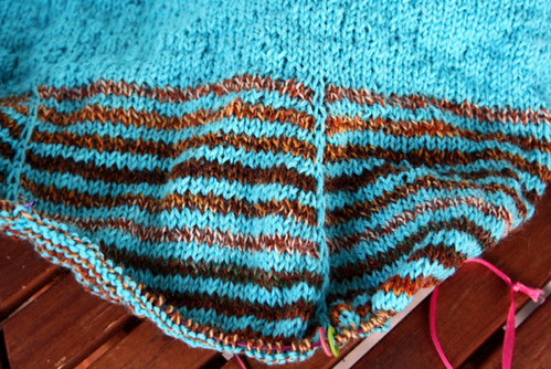 Lankoina miulla on Schoppel-wollen admiralia (turkoosi pohjaväri) sekä saman firman Zauberball crazya (raidat). Huivin alku on vähän epätasainen koska tuo Admiral yritti olla jo toinen huivi mutta purkasin sen enkä jaksanut kastella lankaa välissä.